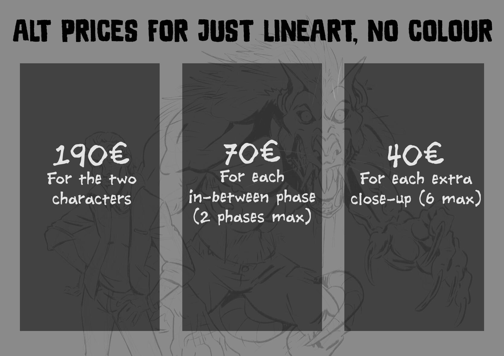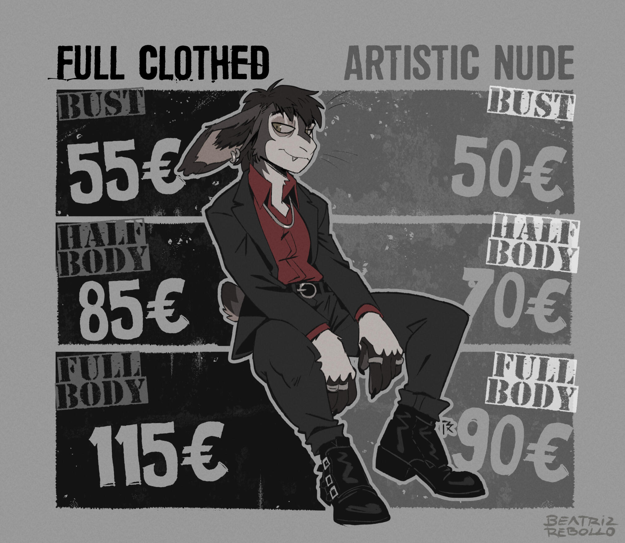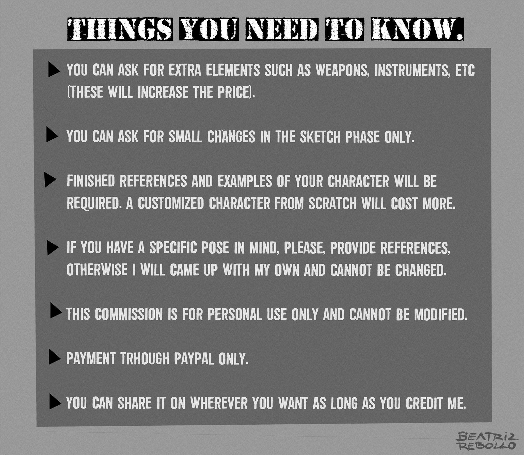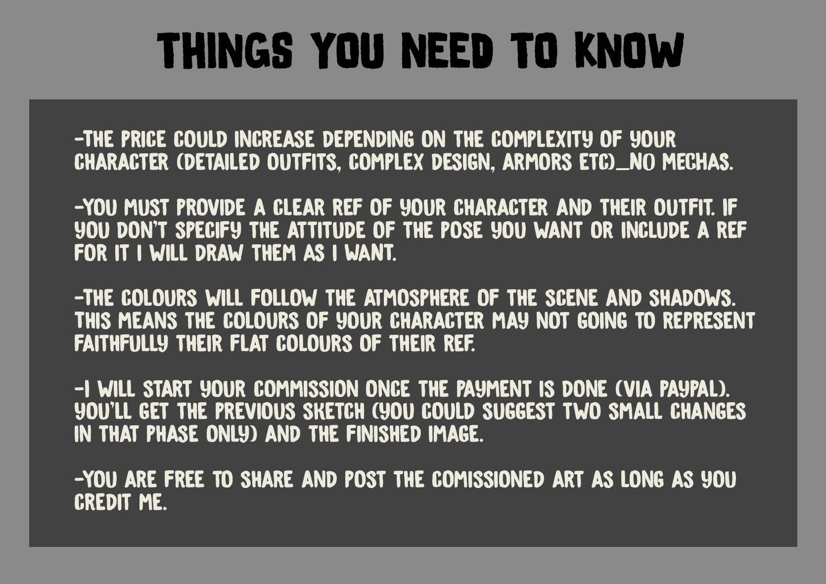 Here you will be able to see the different options and base prices for my usual commissions. These are for personal use only.For professional/commercial use you should contact me via E-mail and explain to me the kind of work you would be interested (these will be charged more compared to the for personal use ones).