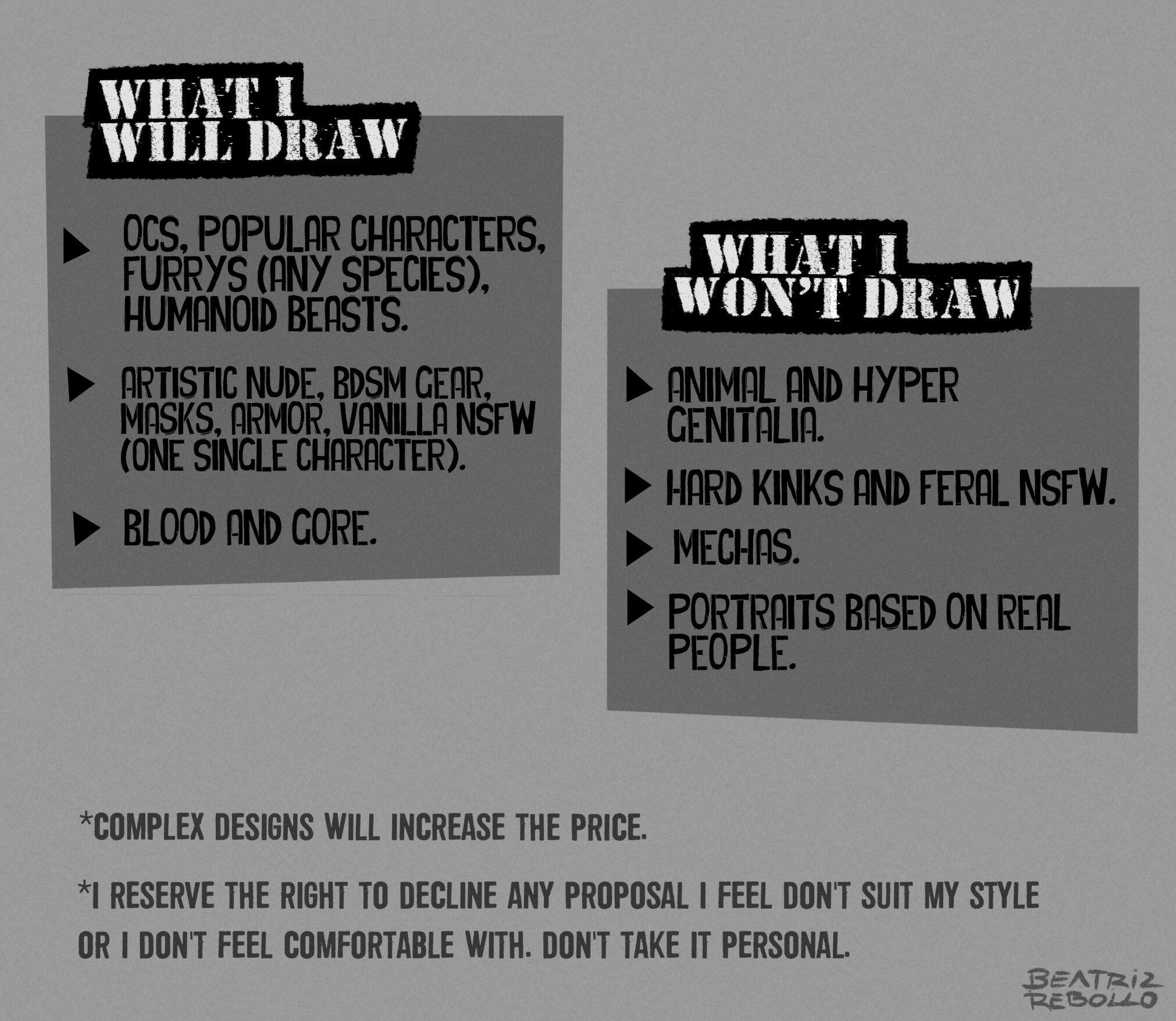 If you are subscribed to any of my last two tiers of Patreon you will have priority to get a slot before I open them publicly, which could take months. These will be announced on my social media such Bluesky or Instagram.IMPORTANT: All work should be paid upfront. I do not make free collaborations.