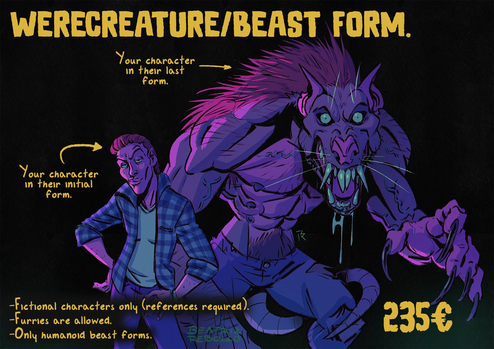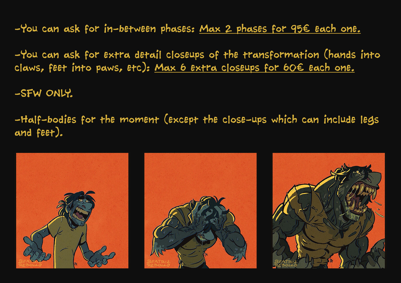 Full colour commissions for werecreatures or beast characters. You can ask for a more detailed transformation sequence.Conditions below.